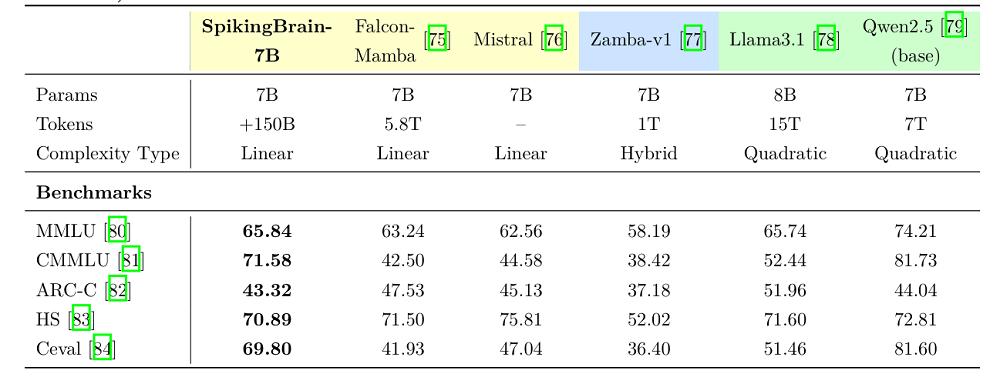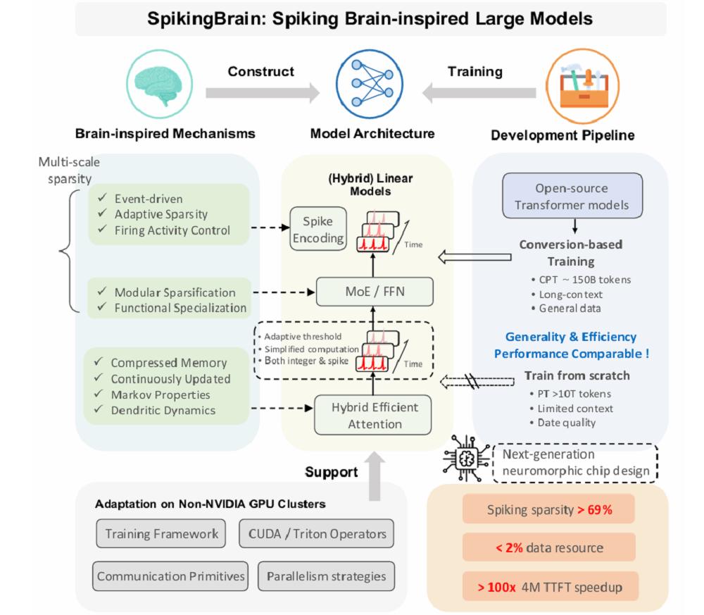 智东西9月10日报道,9月5日,中国科学院自动化研究所发布了类脑脉冲大模型“瞬悉1.0”(SpikingBrain-1.0)的技术报告。SpikingBrain-7B开源模型仅用主流大模型2%的预训练数据,就实现了Qwen2.5-7B 90%的性能,并与Llama-3.1-8B等众多开源Transformer模型相媲美的性能。