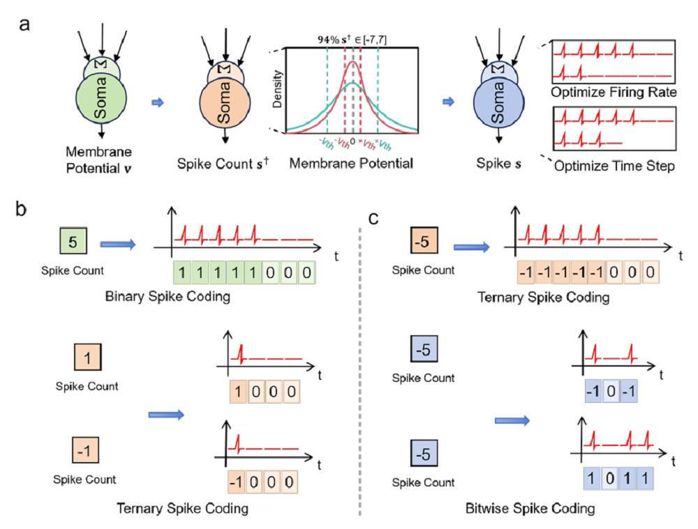 SpikingBrain提供三种编码方式:二值脉冲简单低能耗;三值脉冲支持类似生物神经系统的兴奋-抑制调控,减少时间步和脉冲总数;二进制脉冲可在高计数场景下显著降低计算量和能耗。