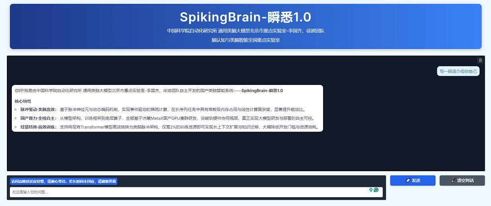 SpikingBrain-1.0共有7B参数量和76B参数量两个版本。9月3日,7B版本的模型已在GitHub、魔搭等平台开源。76B版本的模型暂未开源,但提供了体验链接。