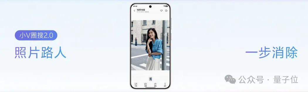 例如当你打开相册,小V就可以找到旅行照片中闯入的路人,一步精准消除;