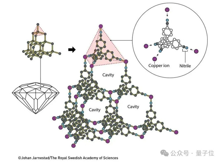 其中四臂分子组合形成化学基团,并在每个末端各吸引一个带正电的铜离子,整体来看,像一颗充满空腔的钻石。