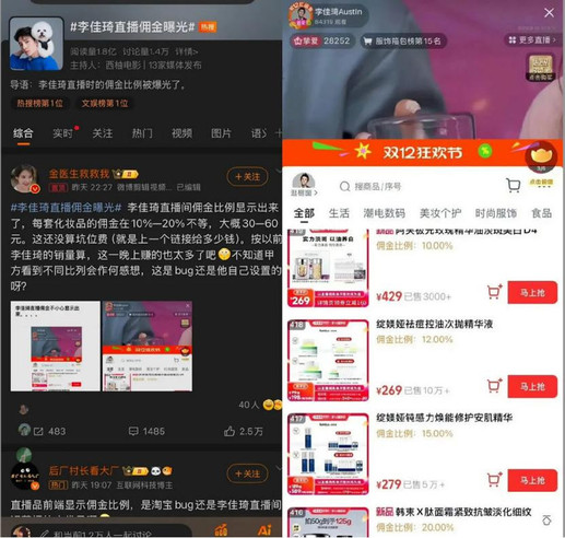 去年12月,李佳琦直播佣金被曝光,多张截图显示,其直播间不同商品的佣金抽成从10%、12%、15%到20%不等,且被曝光佣金的商品多为高价位化妆品。