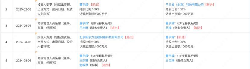 企查查信息显示,与辉同行的全资股东为子三省,后者是董宇辉在2024年12月成立的公司,董宇辉为实际控股人。董宇辉通过终南远眺和本人共计持股90%,长歌有和合伙企业持股10%。