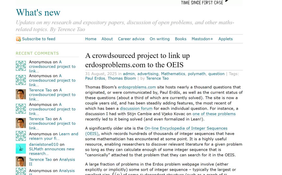[3]https://terrytao.wordpress.com/2025/08/31/a-crowdsourced-project-to-link-up-erdosproblems-com-to-the-oeis/