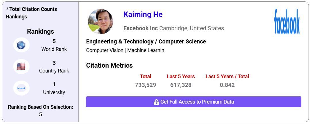 深度残差网络(ResNets)之父——何恺明,成为全球第五位高被引科学家。