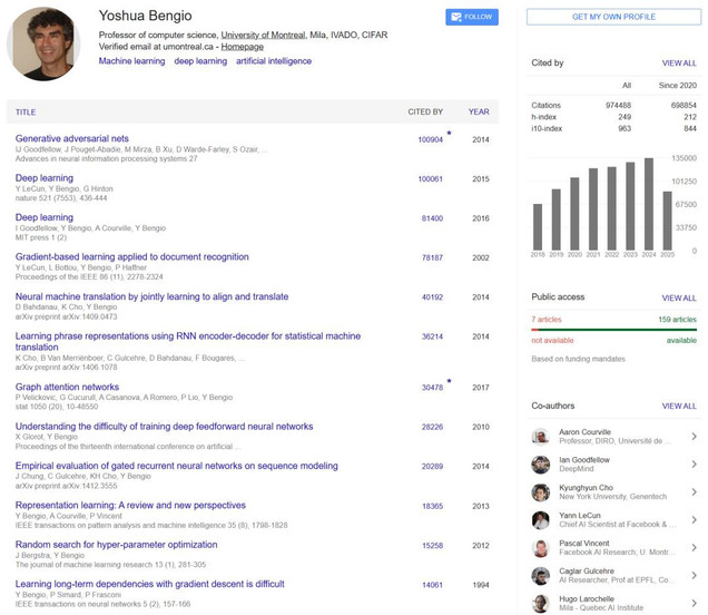 Google Scholar主页中,Bengio更以惊人97万+总引用量,刷新了纪录。