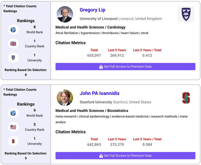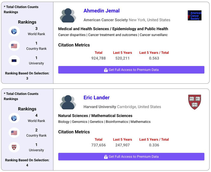 这些排名依据总引用量和近5年引用次数,遴选出全球高被引研究人员。