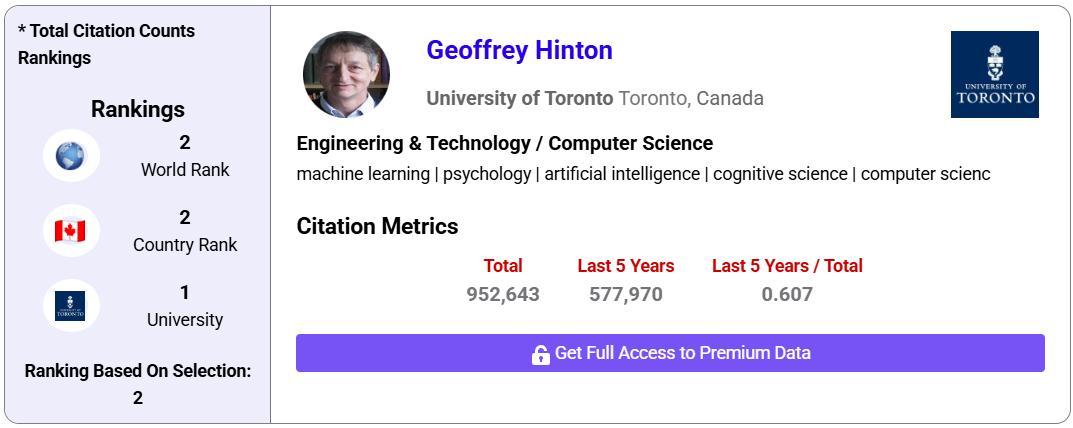 位列全球第二当属AI教父、图灵奖三巨头之一Geoffrey Hinton了。