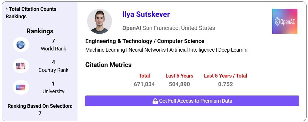 何恺明之后,全球TOP 10中唯一计算机领域高被引科学家,就是Ilya Sutskever了。