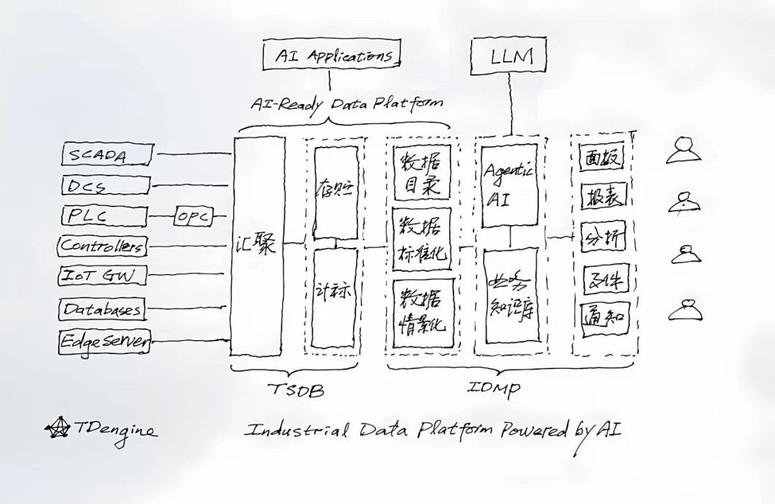 这背后起到决定性因素的,是陶建辉所倡导的“数据平台必须变成 AI-Ready 的平台”,以存储和计算为核心的数据库被改造成为 AI-Ready 的数据平台,而成为 AI-Ready 的数据平台有三个标准:数据目录、数据标准化、数据情景化。经过许久的深思熟虑,他亲自手绘了一张 AI 驱动的工业数据管理平台架构图。