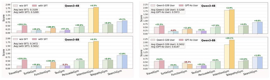 - 经过 UserRL 训练的 Qwen3 在 TravelGym、PersuadeGym、IntentionGym 等交互型任务上超过强闭源模型;跨 8 个 gym 的平均也领先闭源对照,体现出 “针对用户交互的 RL 训练” 能实打实提升能力。