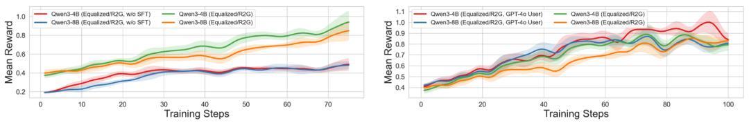 SFT 冷启动(左侧对照)与 GPT-4o 作为模拟用户(右侧对照)均能带来更好的 RL 效果