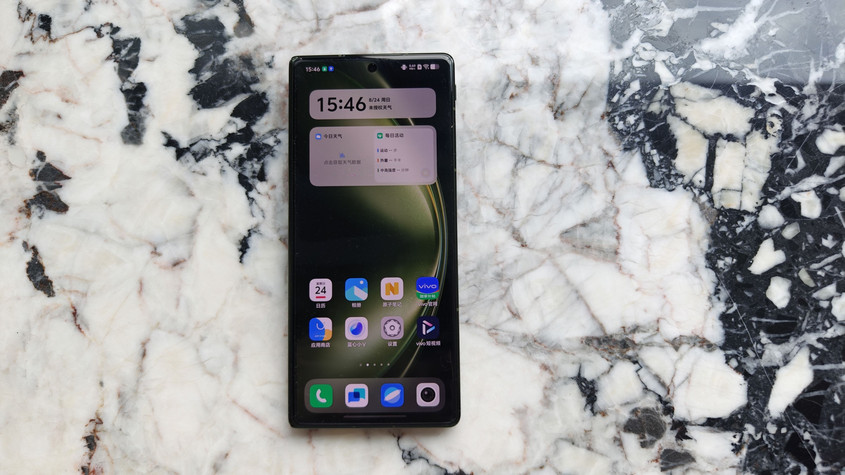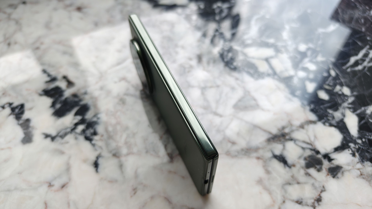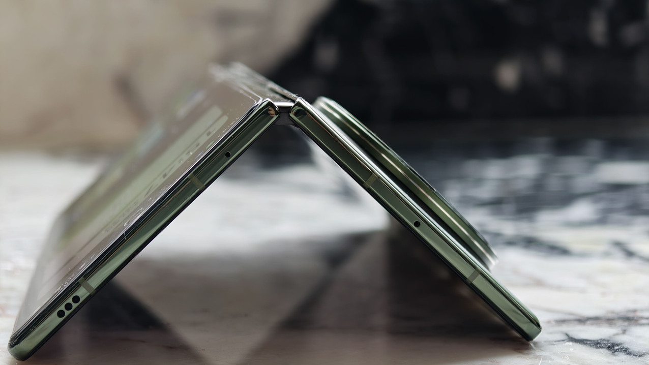 作为折叠屏手机用户,我曾对“轻薄”与“耐用”能否共存存疑。虽然我们上手的是绿色版本,但vivo X Fold5用217克钛度配色版本彻底颠覆了我们的认知——其重量甚至比同品牌直板旗舰X200 Pro(223克)更轻,折叠后仅9.2mm的厚度与普通手机无异,展开后单边厚度仅4.3mm,握持时几乎感受不到铰链凸起。