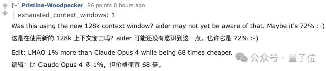 这是什么概念——有网友解释到,这意味着它比Claude Opus 4得分多1%,但价格便宜68倍。