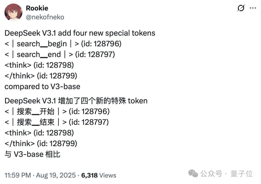有网友察觉到它增加了四个特殊的token,并注意到现版本的V3.1在关闭搜索状态下也会自动搜索。