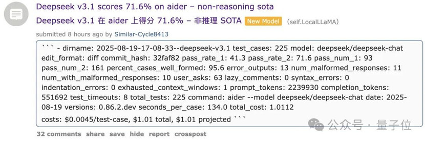 Reddit就有人测试,DeepSeek V3.1在aider上得分71.6%,拿下了非推理模型的SOTA。