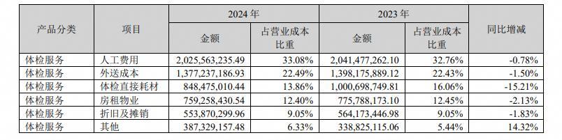 2024年、2023年美年大健康按产品分的经营成本结构(图表源自企业财报)