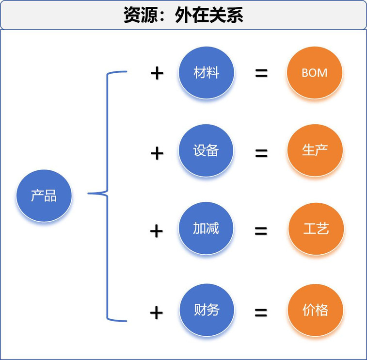 资源外在的关系,是1分别对1230的对应关系,即资源对资源的BOM清单,资源对仓库的库容设置,资源对加减的业务限制,资源对财务的单价预设。