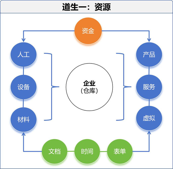 数字化,数字化,就是要先有数字,才能计算和转化,我们的数字是怎么来的呢,就是从我们的道生一来,即一代表的是资源和数字。资源是整个道家管理体系中唯一的对象,因为在后面的一生二的组织架构中,我们是把组织构架拆分为一个个的仓库容器,这些仓库容器也是由单个或多个资源组成的而已,所以组织结构的仓库也可以叫做资源组或资源库,仓库也是我们企业对资源的管理主体,其组成还是资源。资源在资源库里加减出入就是三,三代表所有业务。所以资源是整个道家体系中唯一的对象,这也符合奥卡姆剃刀原理,即如无必要,勿增实体。