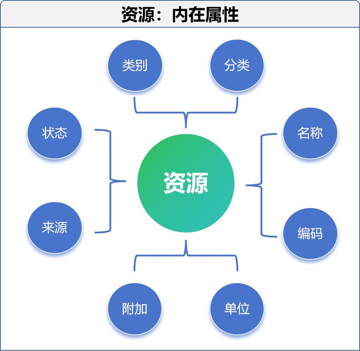 企业资源我们可以分为原有和附带两种,原有就是企业进和出的,进的就是企业买的人机料等,而出的就是企业卖的产品和服务等,进和出的我们都统称为资源。我们对资源的划分是依据约定俗成来的,比如人机料产品服务等,但为什么会区分他们呢,主要就是它们的计量方式不同,比如服务是计次的,产品是计量的,人工是计时的等,有了计量我们才能计算。附带的是什么呢,附带的就是文件和表单等,比如有的产品有说明书,就是一个文档,有的产品有参数表,就是一个表单,有的服务需要按次计时间,那时间也是伴生和附带的。
