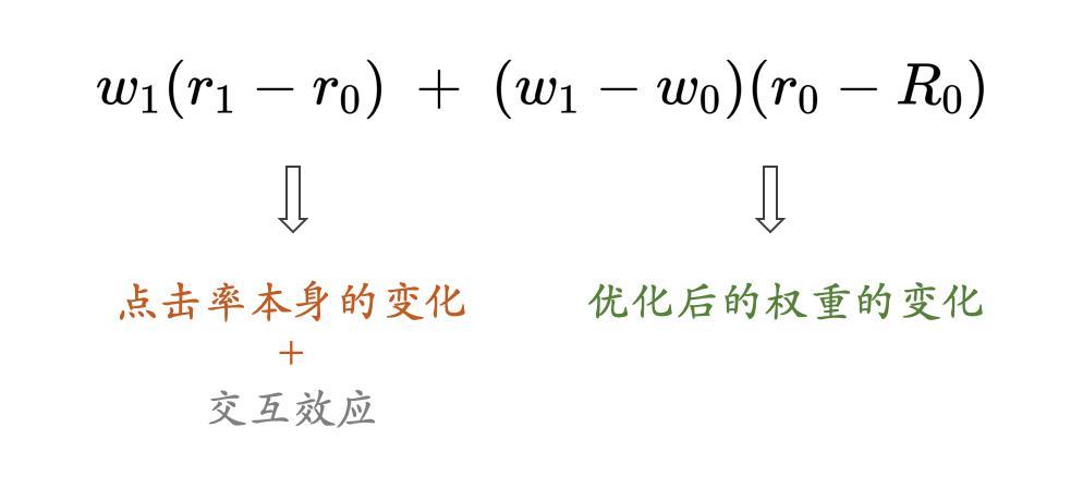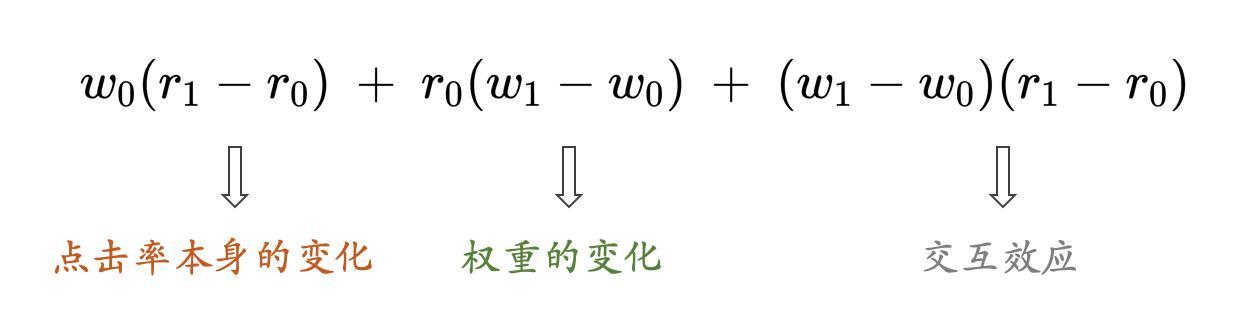 分子部分代表每个元素在波动分析场景下的pvctr前后变化,令:w1代表after的曝光占比,w0代表before的曝光占比,r1代表after的点击率,r0代表before的点击率,分子部分可缩写为: