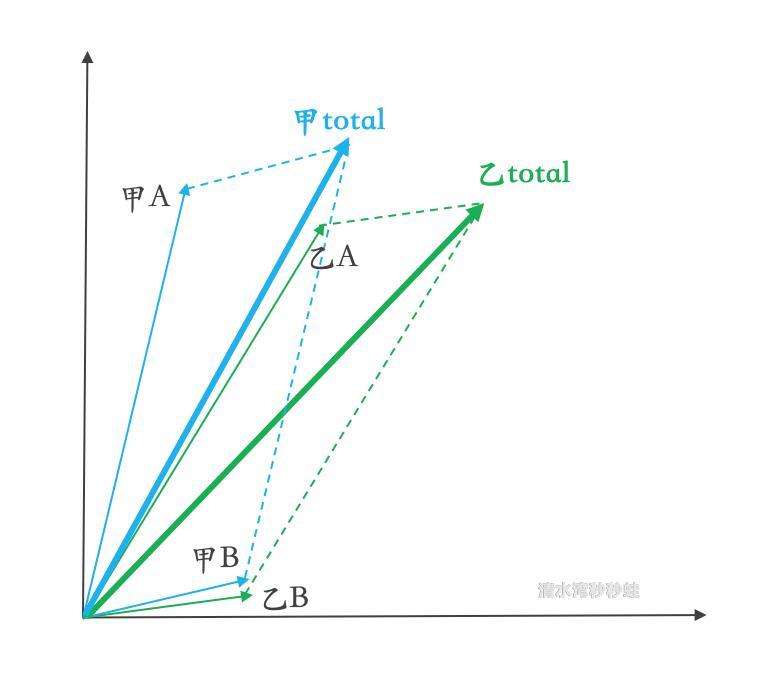 这里可以想象甲和乙是两个人,A代表文科B代表理科,长度代表甲乙在每个学科的投入时长,角度代表甲乙在该学科的考试通过率。