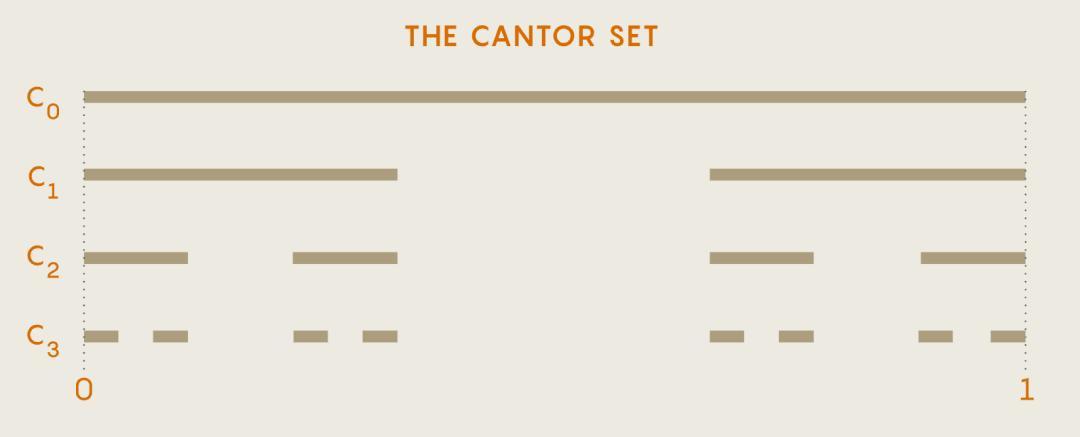 Cantor集是一个经典的数学分形,可以通过一个简单的迭代过程构造:从一条线段开始,去掉其中间的三分之一,剩下两条较短的线段;然后,再分别去掉这两条线段各自中间的三分之一;如此无限重复下去。