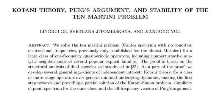 但随着两位中国数学家(北京大学葛灵睿、南开大学尤建功)加入Jitomirskaya的研究,他们进一步推广了这个结论: