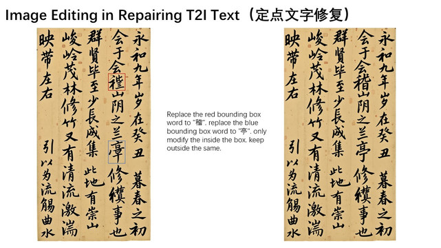 在这幅作品中,几个汉字存在生成错误,Qwen-Image-Edit可以逐步纠正这些错误。例如,用户可以在原始图像上绘制边界框来标记需要校正的区域,并指示Qwen-Image-Edit修复这些特定区域。在这里,演示者希望“稽”字能够正确地写在红色框内,而“亭”字能够准确地呈现在蓝色区域内。