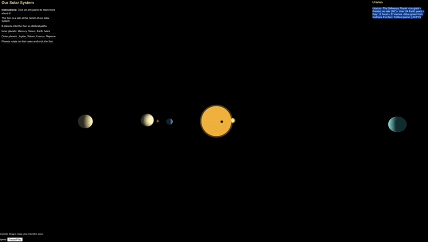通过代码实现物理规律的可视化:比如太阳系运行模拟,网友通过KAT-Coder用three.js制作出了3D动画,并且支持视角的立体旋转。
