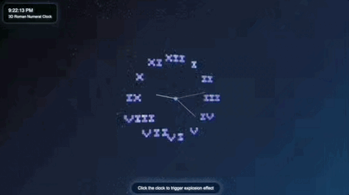 生成赛博朋克时钟,点击即可触发立方体爆炸特性,将罗马数字散布到3D空间中,且包含霓虹灯和粒子效果。