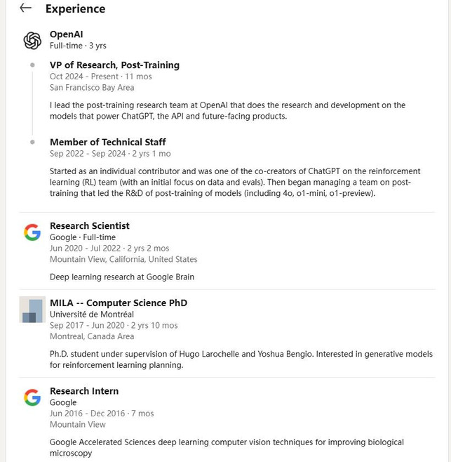 其中,费德斯是ChatGPT的主要贡献者之一,他于2022年加入OpenAI,今年3月宣布离开。在OpenAI任职期间,费德斯领导了OpenAI o1推理模型的开发,还担任后训练团队负责人,负责改进AI模型。在加入OpenAI之前,费德斯还在谷歌大脑担任研究科学家。