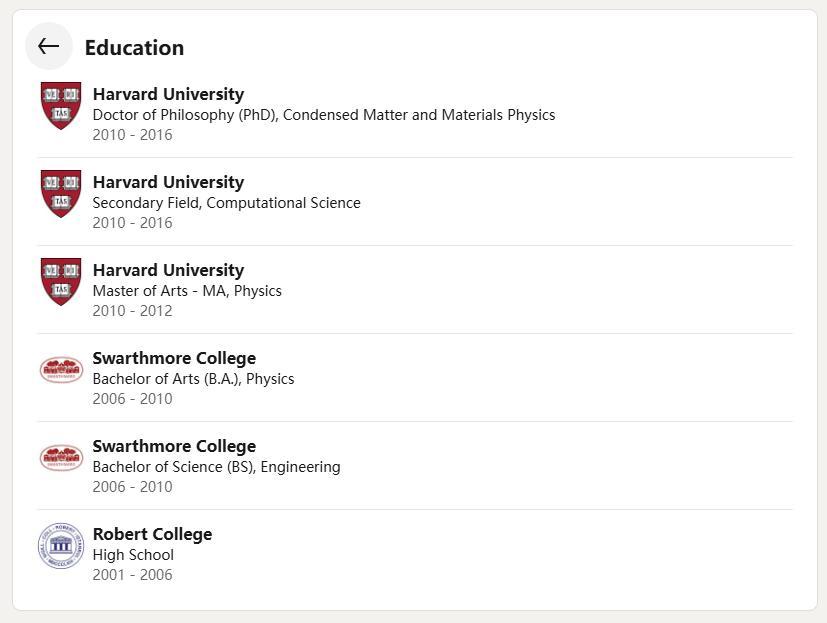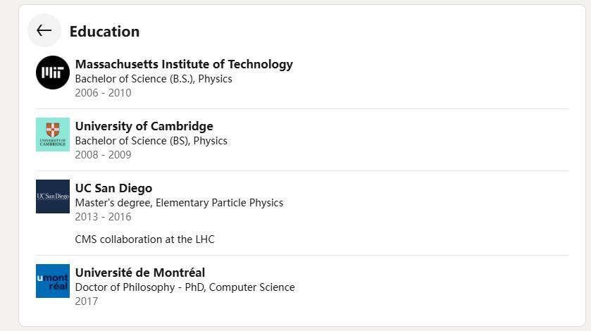 从学术经历来看,他2009年获得剑桥大学物理学学士学位、2010年获得麻省理工学院物理学学士学位,并于2016年获得加利福尼亚大学圣迭戈分校的基本粒子物理学硕士学位、2017年获得蒙特利尔大学计算机科学博士学位。