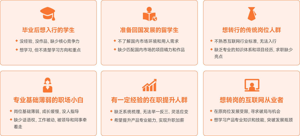 看到这里你是否已经心动不已?如果你是想入行产品的学生、传统行业人员、产品小白,或者是想转岗的互联网从业者、想提升想提升产品经理核心技能。这个产品提升方案就很适合你。