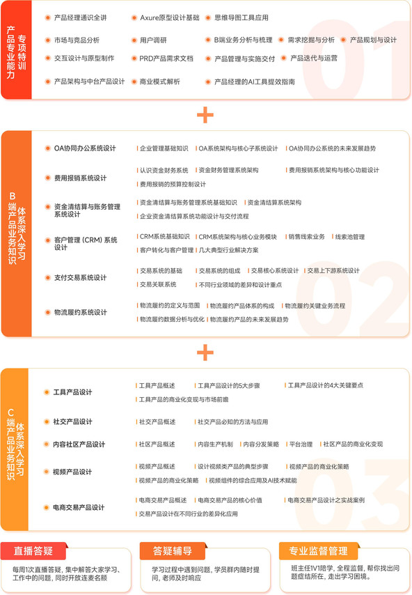 由此,《产品经理私教陪跑实战营》除了底层能力的传授之外,拓展了11大方向的产品业务知识板块,带你从更上层的企业经营管理视角重新理解全业务链路,挖掘产品核心价值;