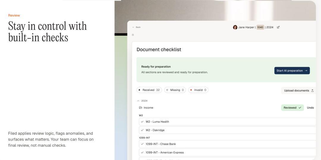从技术架构来看,Filed的系统能够读取文档,运用推理能力应用每个事务所特有的税务策略方法,然后将数据输入到他们现有的软件系统中。当AI发现需要人工干预的情况时,它会标记出来供审查,”让人类保持控制,同时消除繁琐的工作”。这种设计确保了专业判断仍然由人类完成,而机械性的工作则由AI处理。