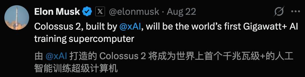 用马斯克的话来说,Colossus 2将成为「世界首个千兆万级+的AI训练超算」。