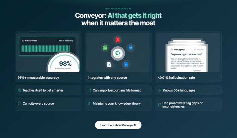竞争环境也在发生变化。虽然市场上还有其他公司如Loopio、Responsive和Rohirrim在解决类似问题,但Conveyor通过专注于AI准确性和真正的端到端自动化,成功地与竞争对手区分开来。他们不只是另一个AI工具,而是在定义客户信任的未来。这种差异化定位帮助他们赢得了Netflix、Carta、Zapier等400多家公司的信任,并成为这一领域的领导者。