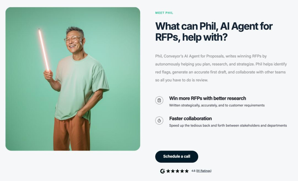 Phil则是Conveyor新推出的RFP专用AI agent,处理的是一个完全不同的挑战——需要更多写作、更多跨功能输入和更多细节处理。Phil能够独立编写完整的、适合销售的RFP回复。他不只是从静态答案库中提取内容——他会阅读文档、过往提交的内容以及来自产品、营销和工程等不同职能部门的内部内容,生成听起来像你的团队写的回复。Phil还处理协调工作:标记红线、识别风险、在需要时自动联系专家。由于他从实时资源(如wiki、共享驱动器、外部站点)中提取信息,无需维护庞大的内容库——系统会自动保持更新。