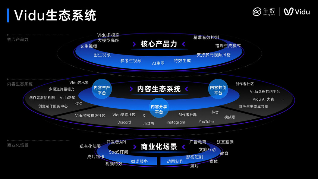 作为多模态赛道的知名公司,生数科技的每一步动态都引发行业关注。2023年4月,该公司发布中国首个全面对标Sora的视频大模型产品Vidu,并于7月在全球发布。上线8个月,其年度经常性收入(ARR)突破2000万美元,成为近年来AI赛道炙手可热且极具影响力的创新公司之一。当前,生数科技业务已经覆盖全球200+国家和地区,累计生成视频数量超过4亿,仅其核心功能参考生视频数量就已超过1亿,商业内容素材占比超过50%,标志着其Vidu系列产品正式进入生产力场景。
