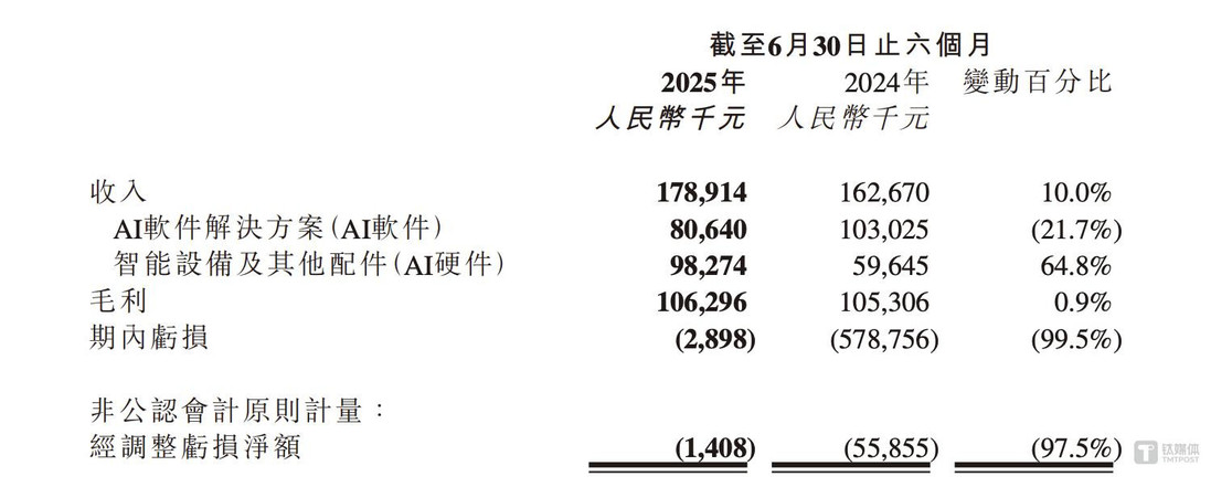 其中,今年上半年,AI硬件收入为9830万元,同比增长64.8%,占总收入比重接近60%;AI软件收入为8064万元,同比下降21.7%。