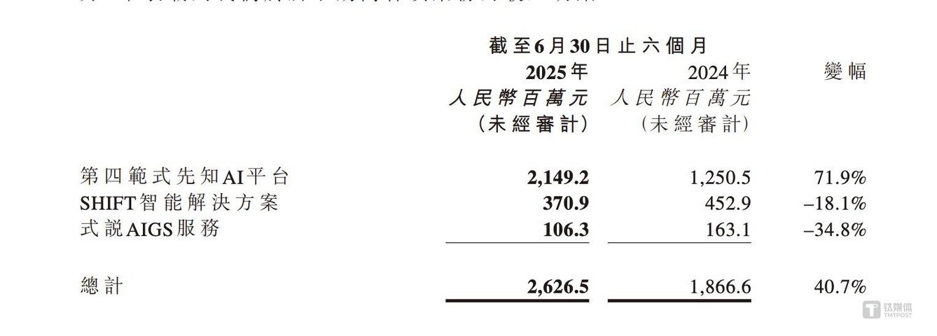 具体业务层面,集团收入来源于三个板块:先知AI平台、SHIFT智能解决方案、式说AIGS服务。