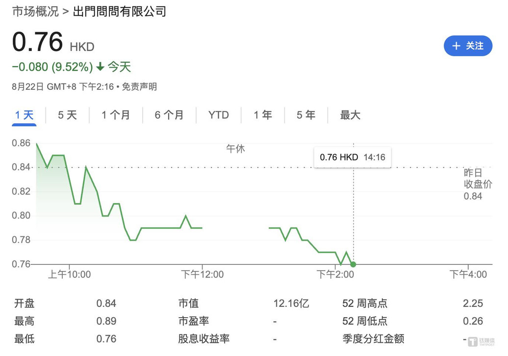 截至发稿前,第四范式股价涨2.22%,报55.25港元/股;出门问问跌9.52%,报0.76港元/股,市值约12亿港元。