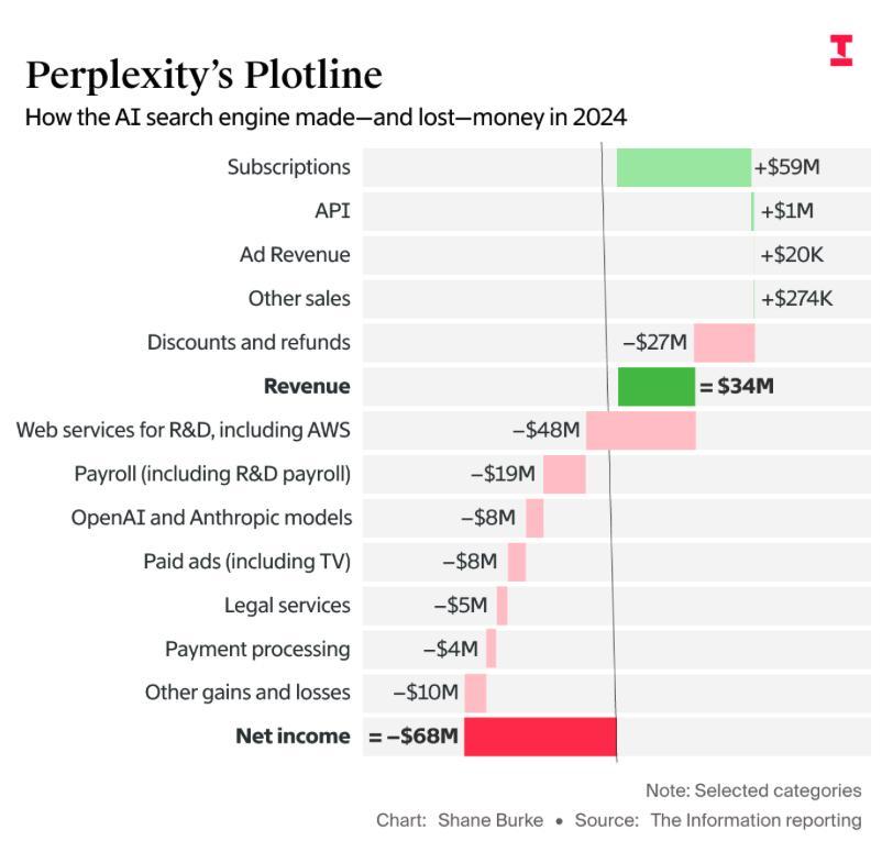 彭博社披露的财务数据显示,2024年,Perplexity在三方模型及云服务上的支出高达5700万美元,远超3400万美元的收入体量。