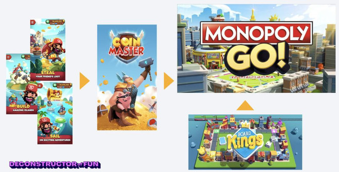 「金币掠夺」玩法的演变:Jelly Button推出《Pirate Kings》→ Moon Active 借鉴其思路,用老虎机取代炮弹攻击,打造出吸金神器《Coin Master》→ Jelly Button又做了掷骰子+棋盘玩法的《Board Kings》→ Scopely借用棋盘思路,用老虎机替代骰子,叠加超级IP,打造出《Monopoly Go!》并再次吸金无数。