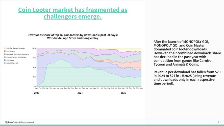 成功总会引来模仿者。虽然《Coin Master》和《Monopoly Go!》依旧占据主导,但新的挑战者已经涌入市场,比如《Carnival Tycoon》《Animals & Coins》等等,它们正推动下载量增长,但也导致每次下载收入略有下降:从2024年的29美元降至2025年上半年的27美元。
