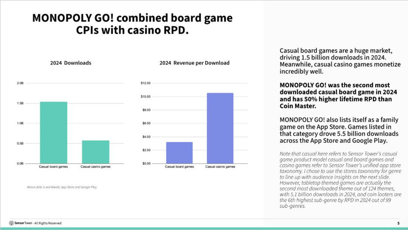 《Monopoly Go!》的精妙之处就在于其混合式受众策略:它用便宜的桌游CPI(每次安装成本)吸引用户,再用高昂的赌场式变现(每次下载收入)实现盈利。