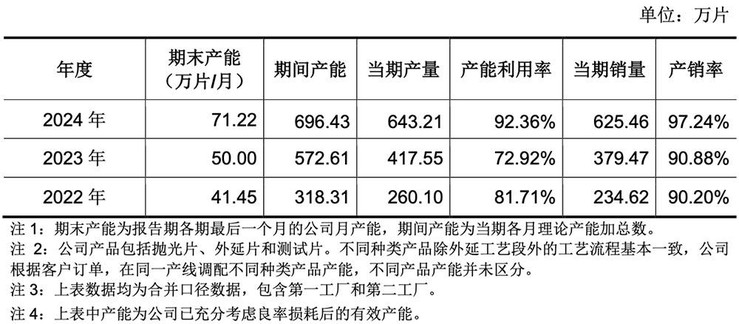 截至2024年末,通过技术革新和效能提升,西安奕材已将第一工厂50万片/月产能提升至62万片/月,同时第二工厂产能爬坡已到达8万片/月,报告期内始终保持90%以上产销率。