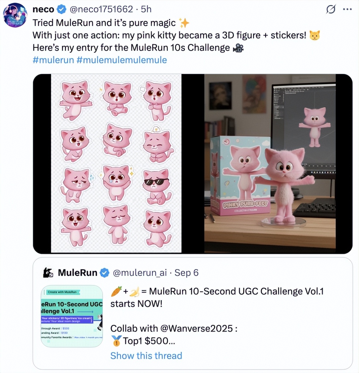 自8月14日启动内测至今,MuleRun吸引了大量海内外创作者、开发者和用户的关注与体验,并出现了多款热门Agent产品,例如能完成超长游戏任务的Honkai: Rail Star Booster、能实现高质量3D建模的Blender MCP、能像分析师一样产出投资报告的美股投研Agent,以及能生成社媒爆款内容的Nano Banana系列Agent。