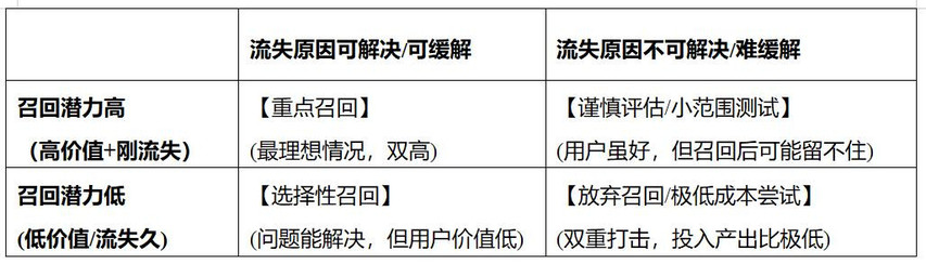 根据上述召回潜力高低分析以及流失原因是否可解决,可以得出下面四个召回决策方向: